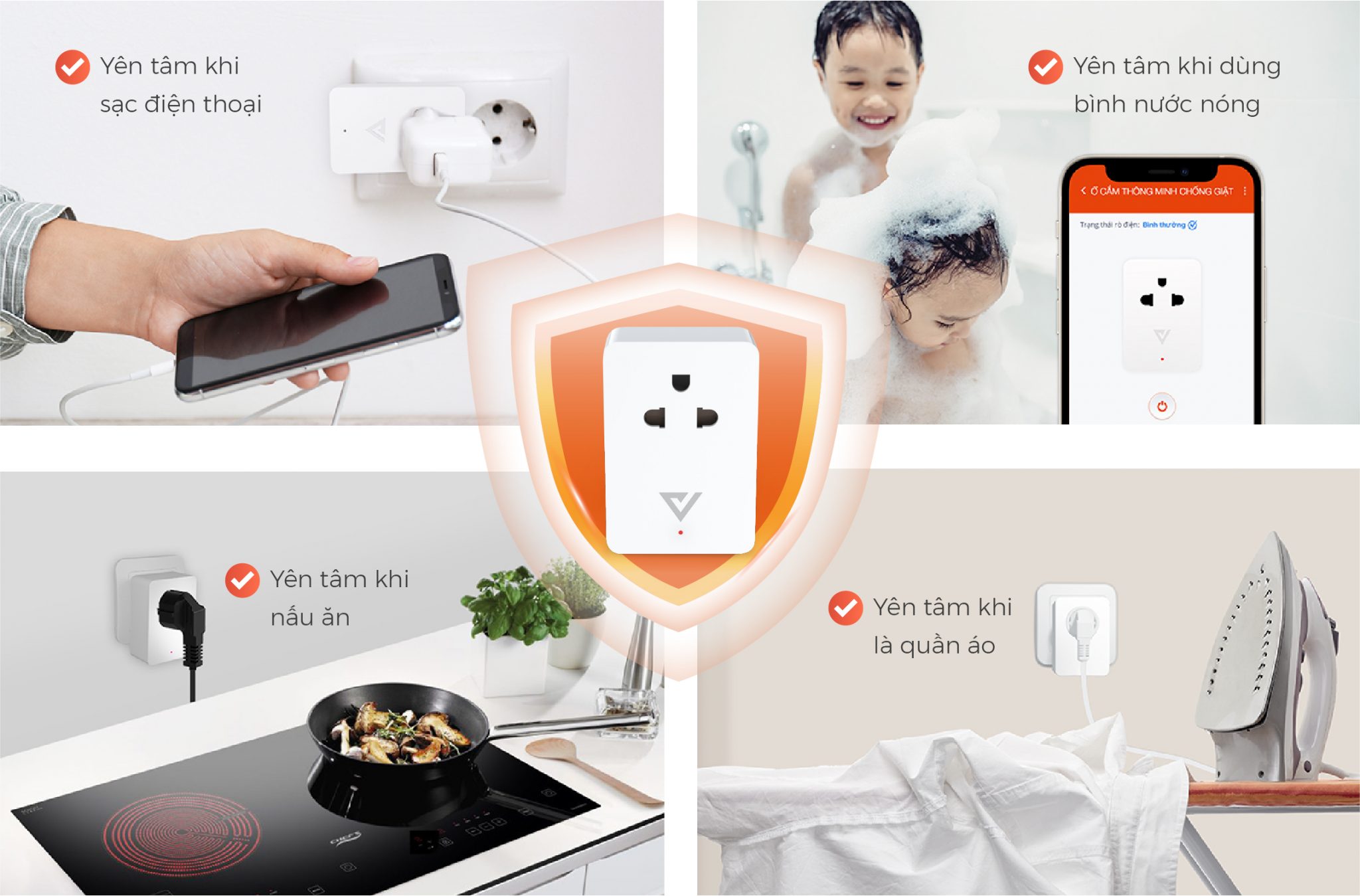 - An Toàn Cao: Ổ cắm thông minh tích hợp các tính năng bảo vệ quá tải. Chống cháy nổ, tự động ngắt khi phát hiện nguy cơ chập cháy.