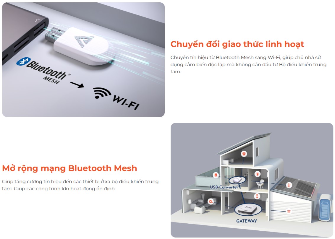 Bộ chuyển đổi và mở rộng mạng (USB Converter) của Vconnex có 2 tính năng: là thiết bị mở rộng phạm vi hoạt động mạng Bluetooth Mesh (Repeater) và chuyển đổi giao thức truyền thông (Transfer). Từ đó giúp tối ưu sự hoạt động ổn định và cấu hình linh hoạt của hệ thống nhà thông minh.