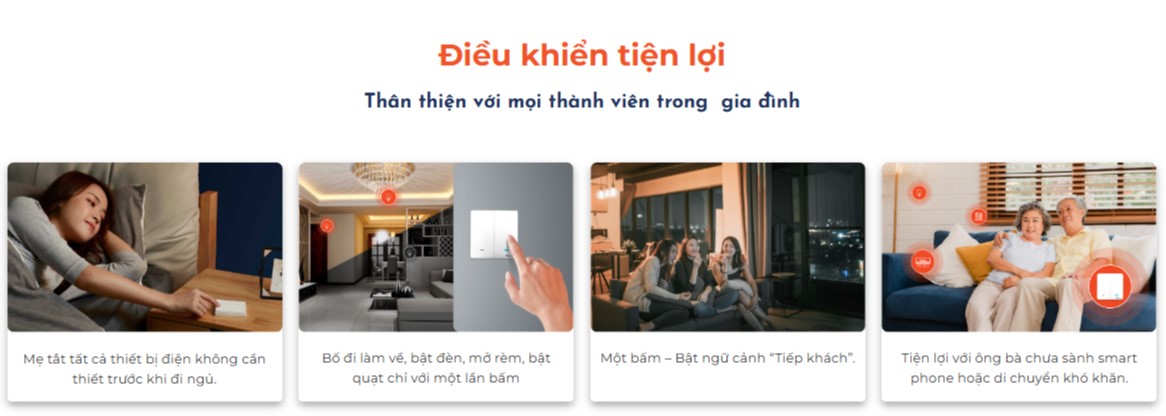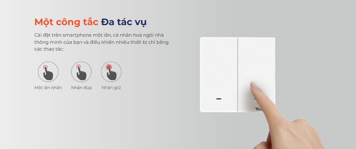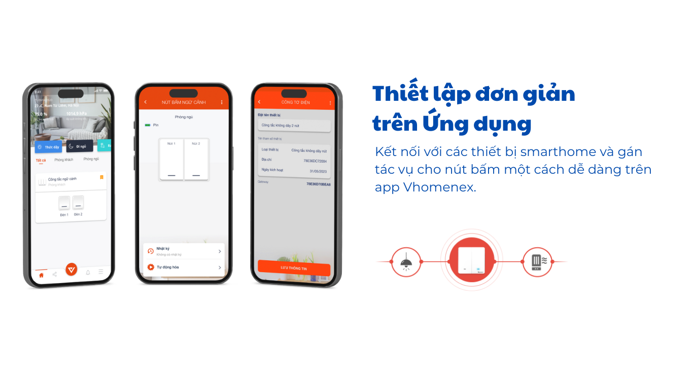 Công tắc không dây hay còn được gọi là công tắc ngữ cảnh dùng nguồn pin và truyền tín hiệu bằng sóng không dây. Thiết bị này không hoạt động độc lập, mà kết nối với các thiết bị thông minh khác trong hệ sinh thái Vconnex để điều khiển kịch bản, ngữ cảnh tiện lợi. Chủ nhà chỉ cần bấm nút trên công tắc là có thể kích hoạt các kịch bản nhà thông minh được thiết lập trước đó trên ứng dụng di động.